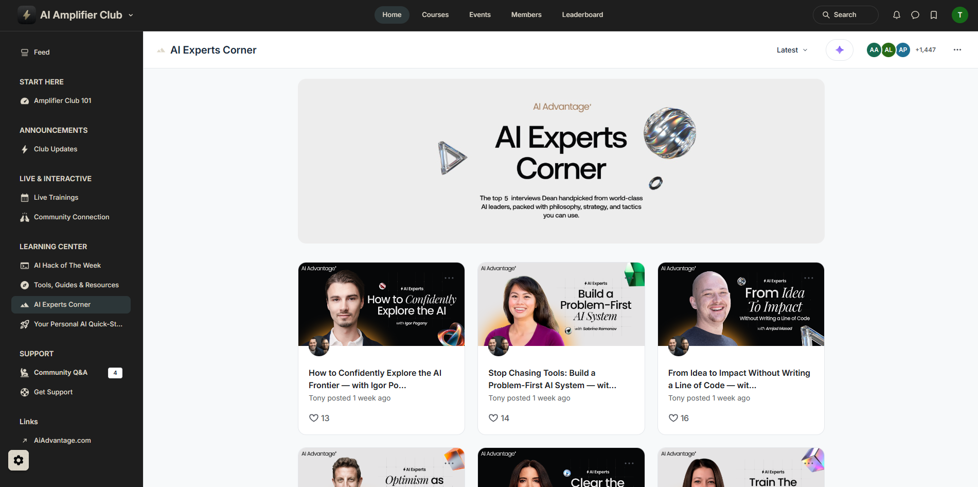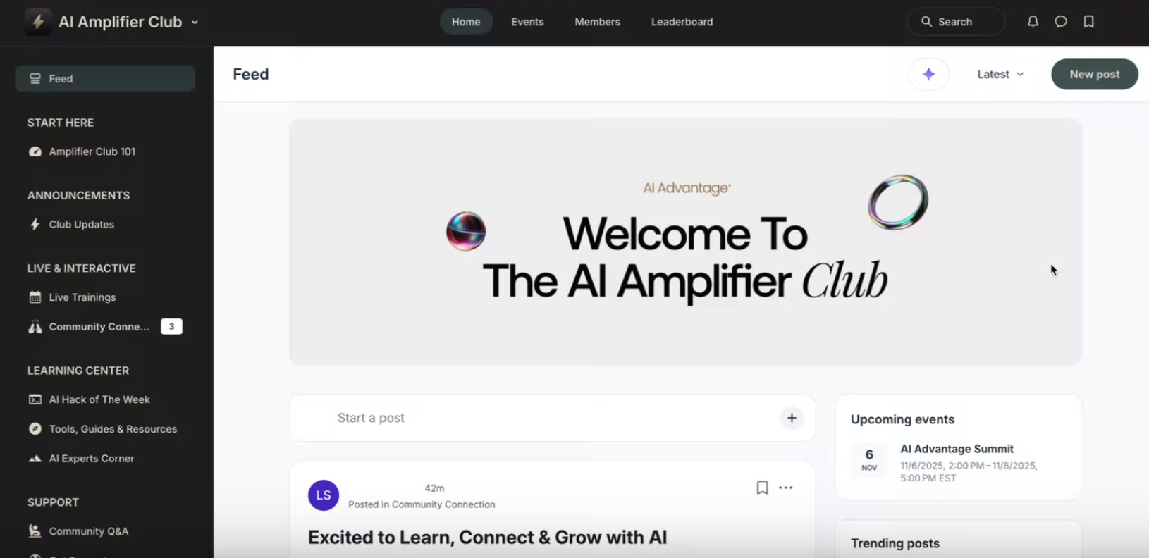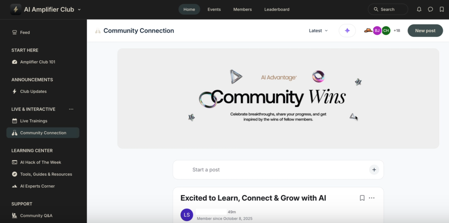 The AI Amplifier Club — a community space where members can connect, share insights, access exclusive AI resources, and participate in live training sessions.