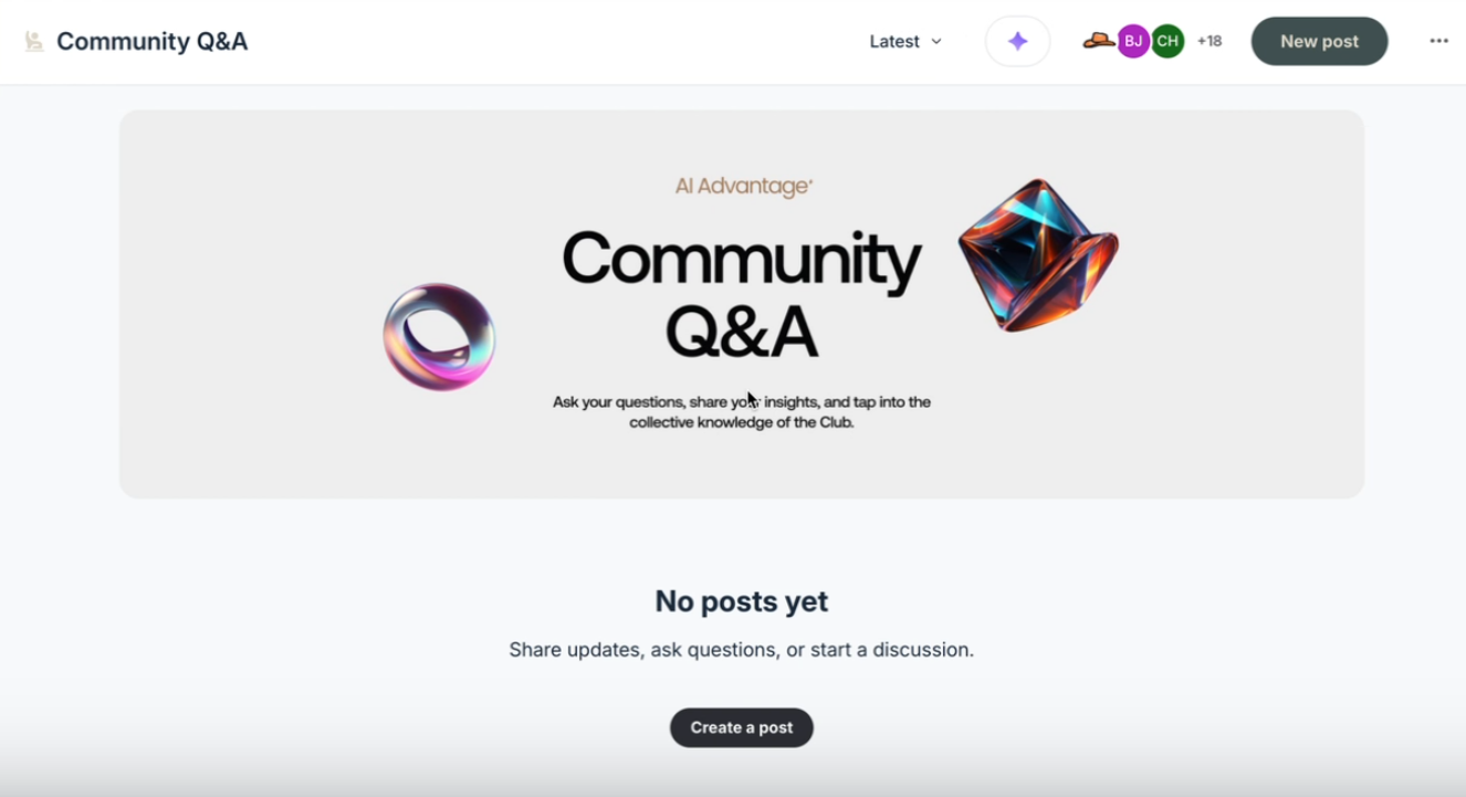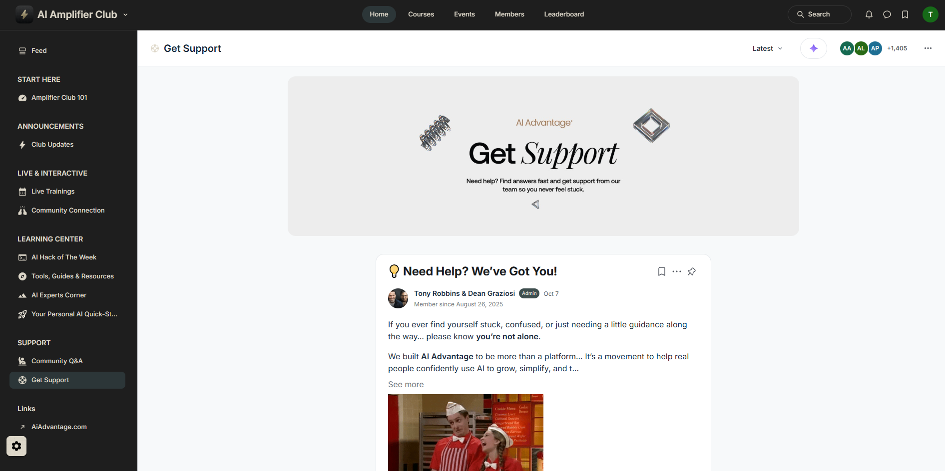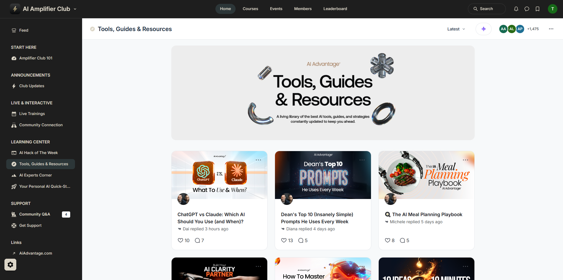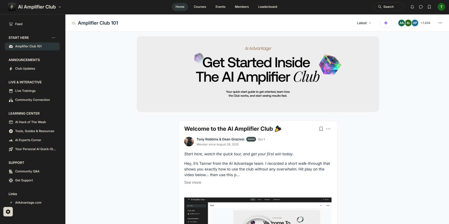The AI Amplifier Club — a community space where members can connect, share insights, access exclusive AI resources, and participate in live training sessions.