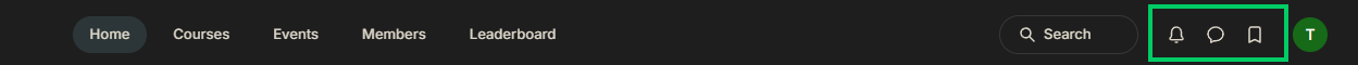 The main top navigation bar houses the Home, Courses, Events, Members and Leaderboard tabs.