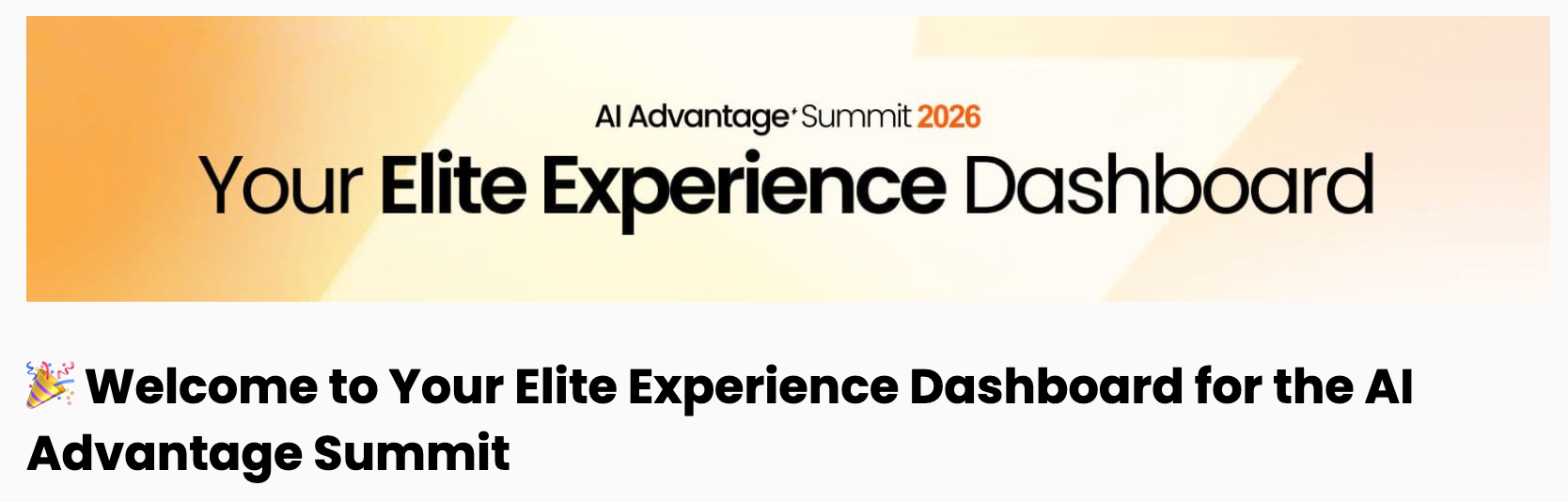 If you are a VIP Elite Experience attendee of the AI Advantage Summit, you will have lifetime access to your personal event dashboard. Your personal event dashboard login link should have been emailed to you! Please check spam/junk/promotions folders if you do not see it in your primary inbox. If you still can't find it, please reach out to our customer support team!