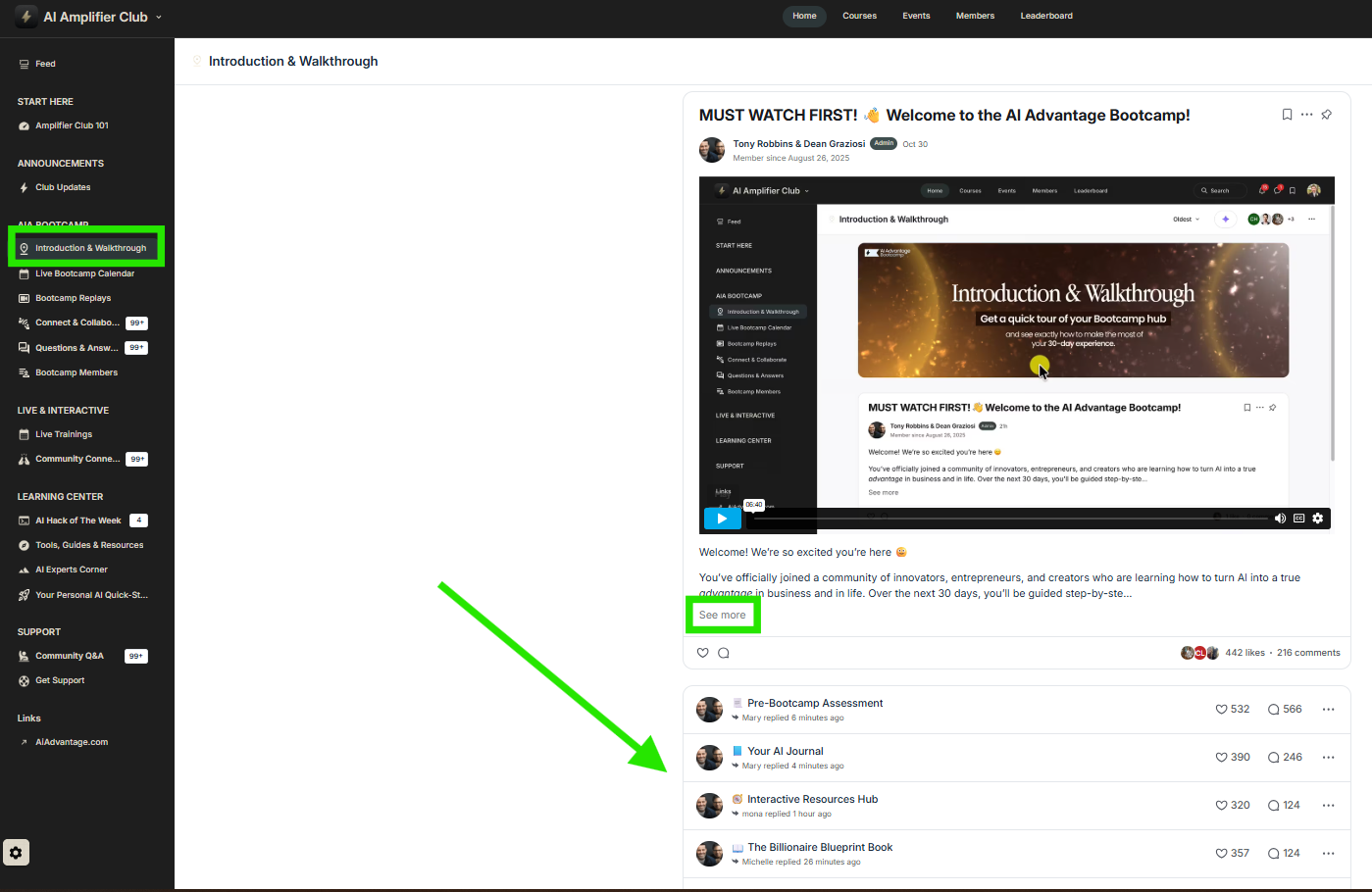 As mentioned in the video above, be sure to Navigate to the Introduction & Walkthrough tab within the AIA Bootcamp section of your AI Amplifier Club portal. The under the "MUST WATCH FIRST! 👋 Welcome to the AI Advantage Bootcamp!" post, click "See More" so you can review the details to: