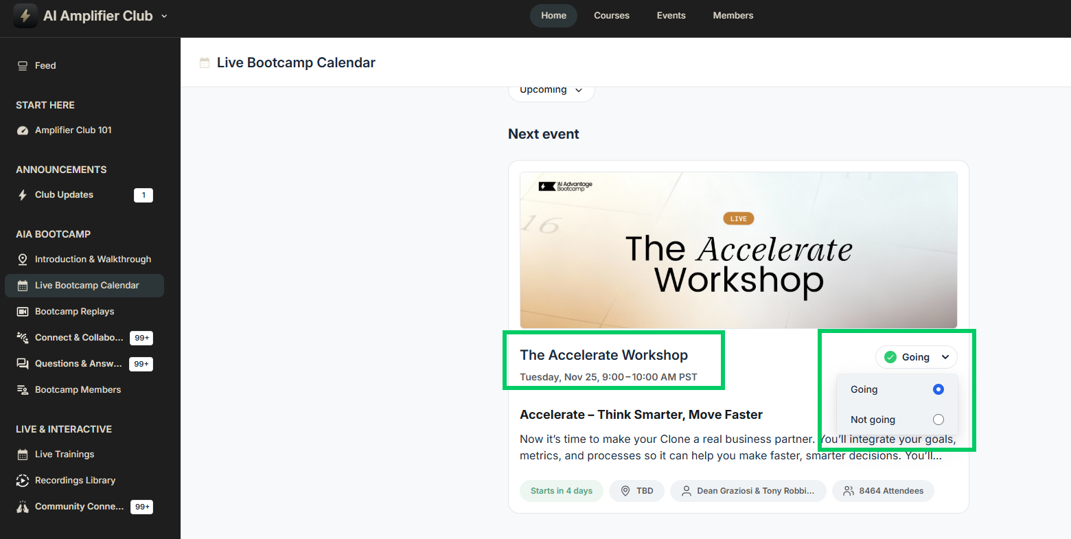 Then, navigate to the Live Bootcamp Calendar tab, click RSVP and Going to reserve your spot for The Accelerate Workshop: