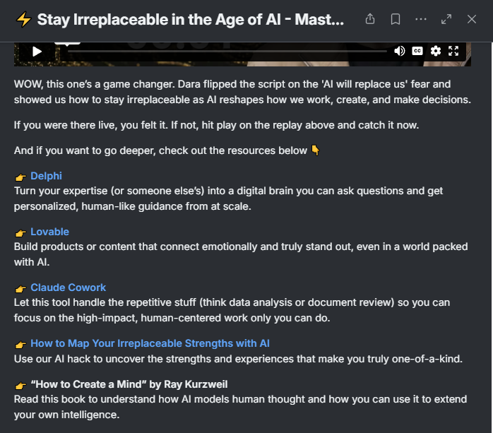 - Within the list of past replays, you'll find - ⚡ Stay Irreplaceable in the Age of AI - Masterclass #5.