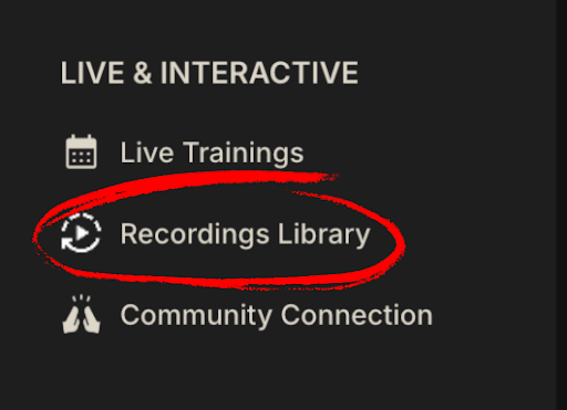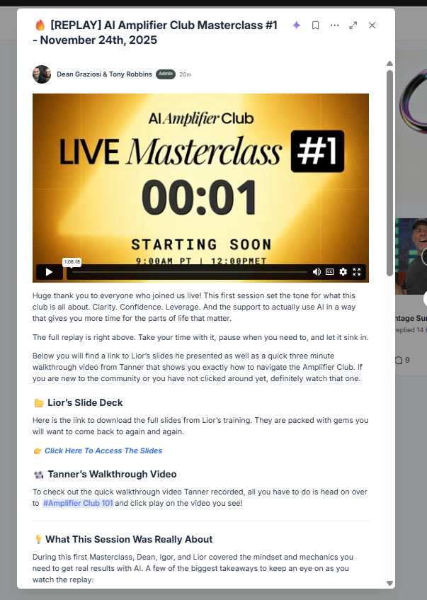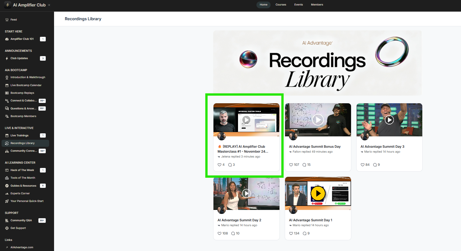 Once within the AI Amplifier Club, navigate to the Recordings Library tab under the Live & Interactive section, and click on the [REPLAY] AI Amplifier Club Masterclass #1 - November 24th, 2025 recording.