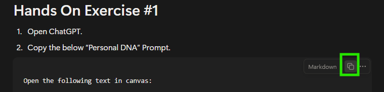 Then, scroll down to the Hands-On Exercise #1 prompt. Copy the prompt by using the copy button notated below in green. Please note this button will only appear when your cursor is hovering over the prompt.