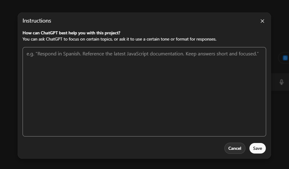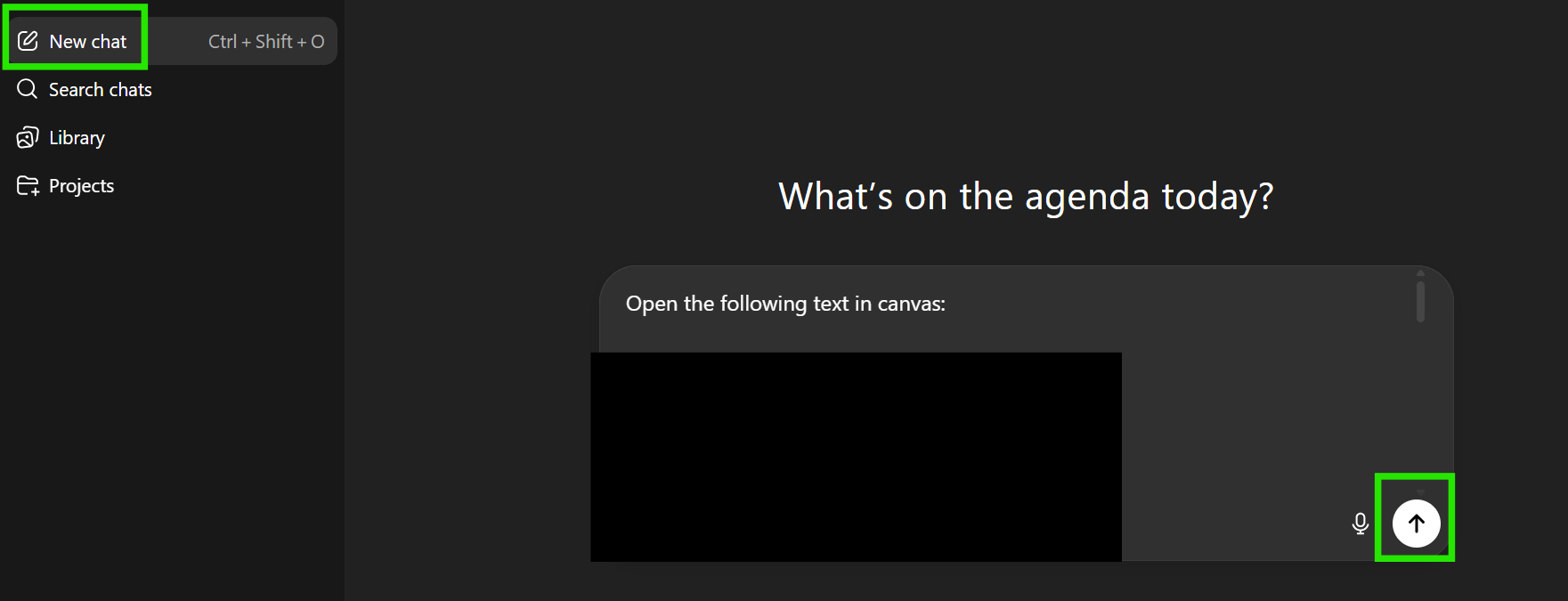 Go back to ChatGPT, start a New chat, paste this prompt into the message box, and press Enter or click the Send button (↑). This opens a Canvas, which is an editable chat space where you can fill in your personal answers.