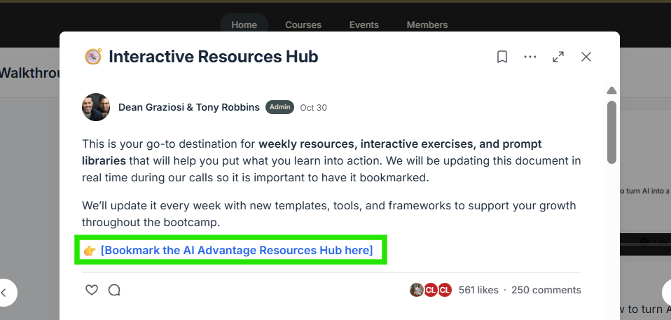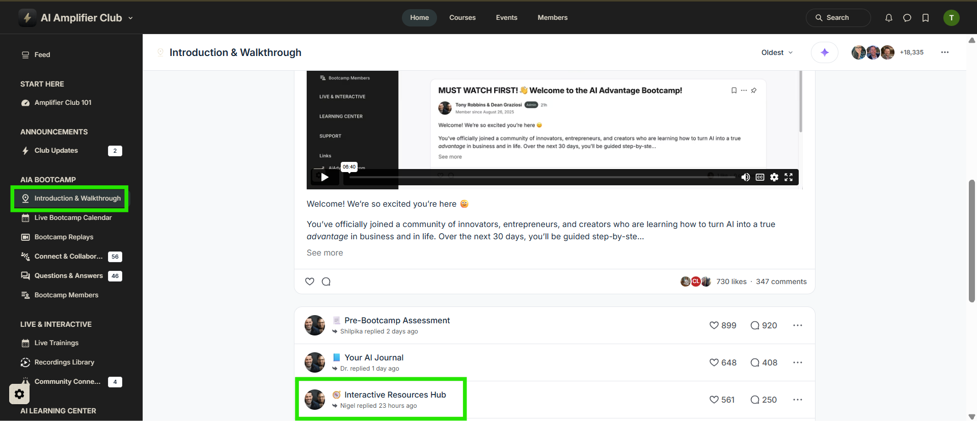 AI Amplifier Club —> Introduction & Walkthrough tab under the AIA Bootcamp Section —> Scroll down and locate the Interactive Resources Hub:
