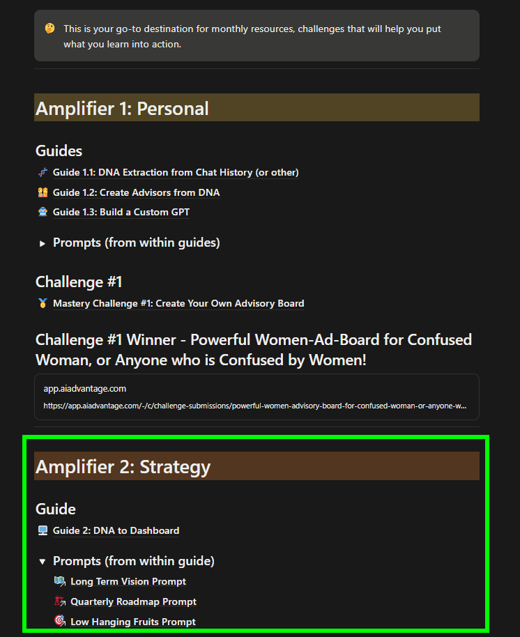 For this training, navigate to Amplifier 2: Strategy within the Interactive Resource Hub. Inside, you’ll find Guide 2: DNA to Dashboard and the three core prompts that walk you through the entire process step by step. The linked prompts are the exact prompts required to complete the training, so be sure to work directly from them.