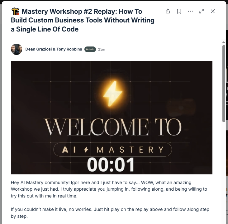 For this session, select 🏗️ Mastery Workshop #2 Replay: How To Build Custom Business Tools Without Writing a Single Line Of Code