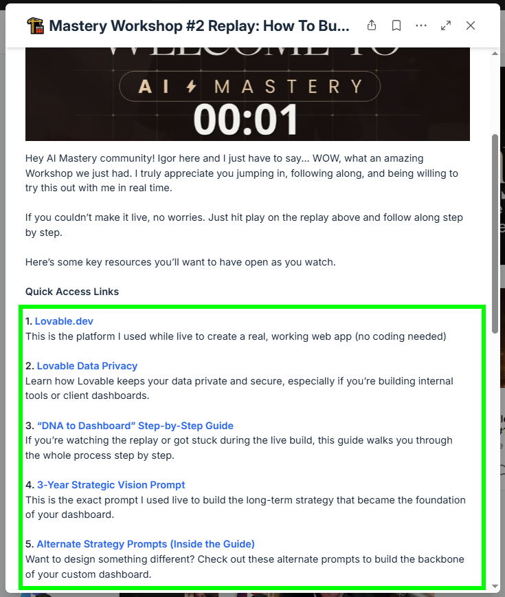 Important Note: Guide 2: DNA to Dashboard is also available directly under the Quick Access Links in the Mastery Workshop #2 replay post!