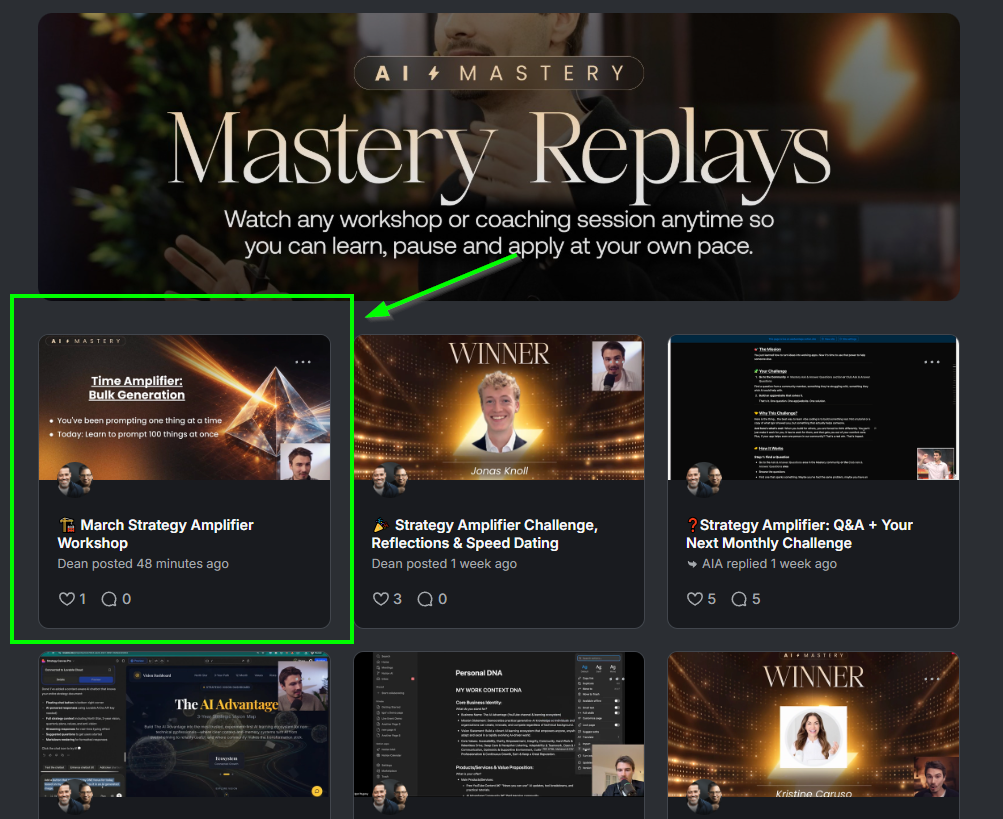 On the left sidebar of your AI Advantage Club dashboard, under AI Mastery, select Mastery Replays.