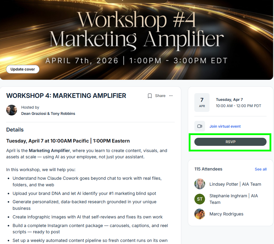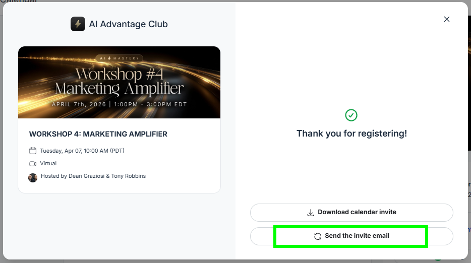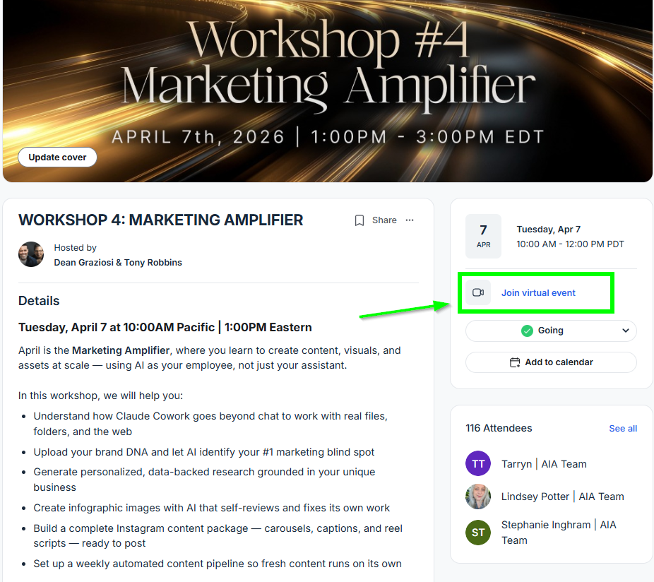 When it is time to join the workshop, open up the link in your calendar or simply log into your AI Advantage Club account and navigate to WORKSHOP 4: MARKETING AMPLIFIER page under Mastery Event Calendar and select Join Virtual Event, as shown below: