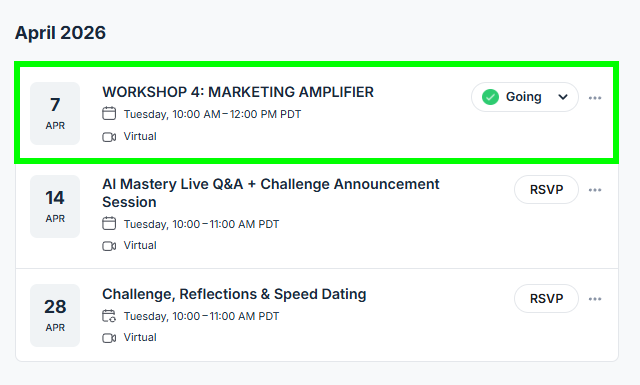 You’ll see a list of all upcoming events and workshops from the AI Mastery Experience.
