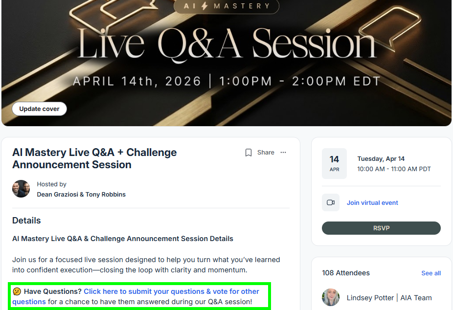 On Tuesday, April 14 at 10:00 AM PT l 1:00 PM ET, we will have our monthly AI Mastery Live Q&A + Challenge Announcement Session.